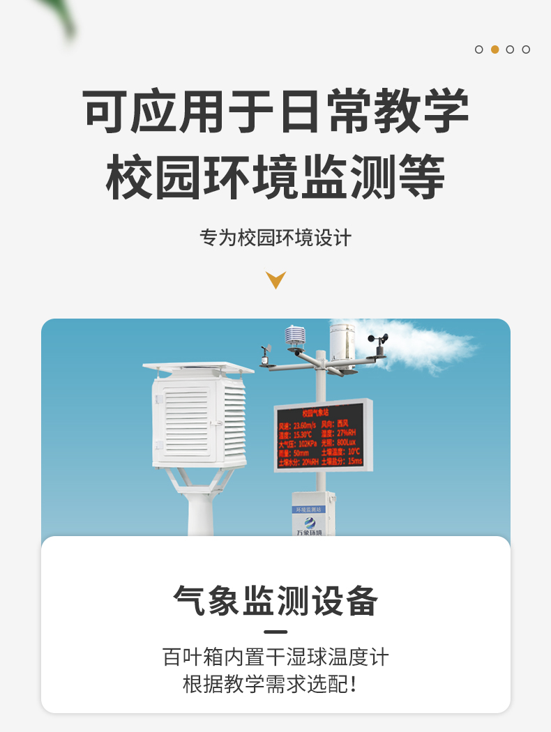 中小學校園氣象站解決方案WX-XQ4校園氣象站是一款高度集成、低功耗、可快速安裝、便于教學使用的科研級氣象站。